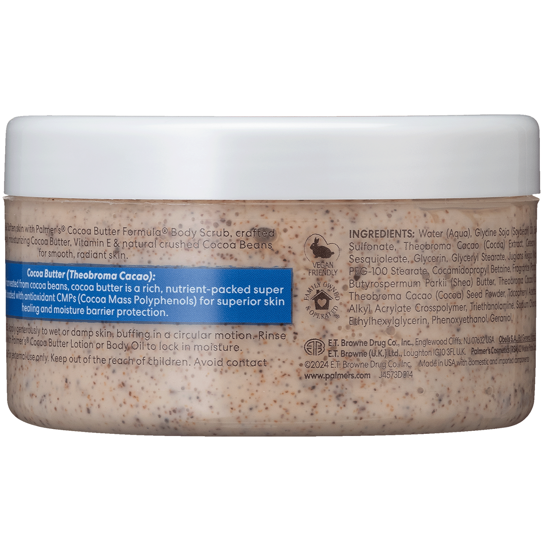 Exfoliate & Soften skin with Palmer's® Cocoa Butter Formula Body Scrub, crafted with deeply moisturising Cocoa Butter, Vitamin E & natural crushed Cocoa Beans for smooth, radiant skin. Cocoa butter is a rich, nutrient-packed super ingredient loaded with antioxidant CMPs (Cocoa Mass Polyphenols) for superior skin healing and moisture barrier protection.
