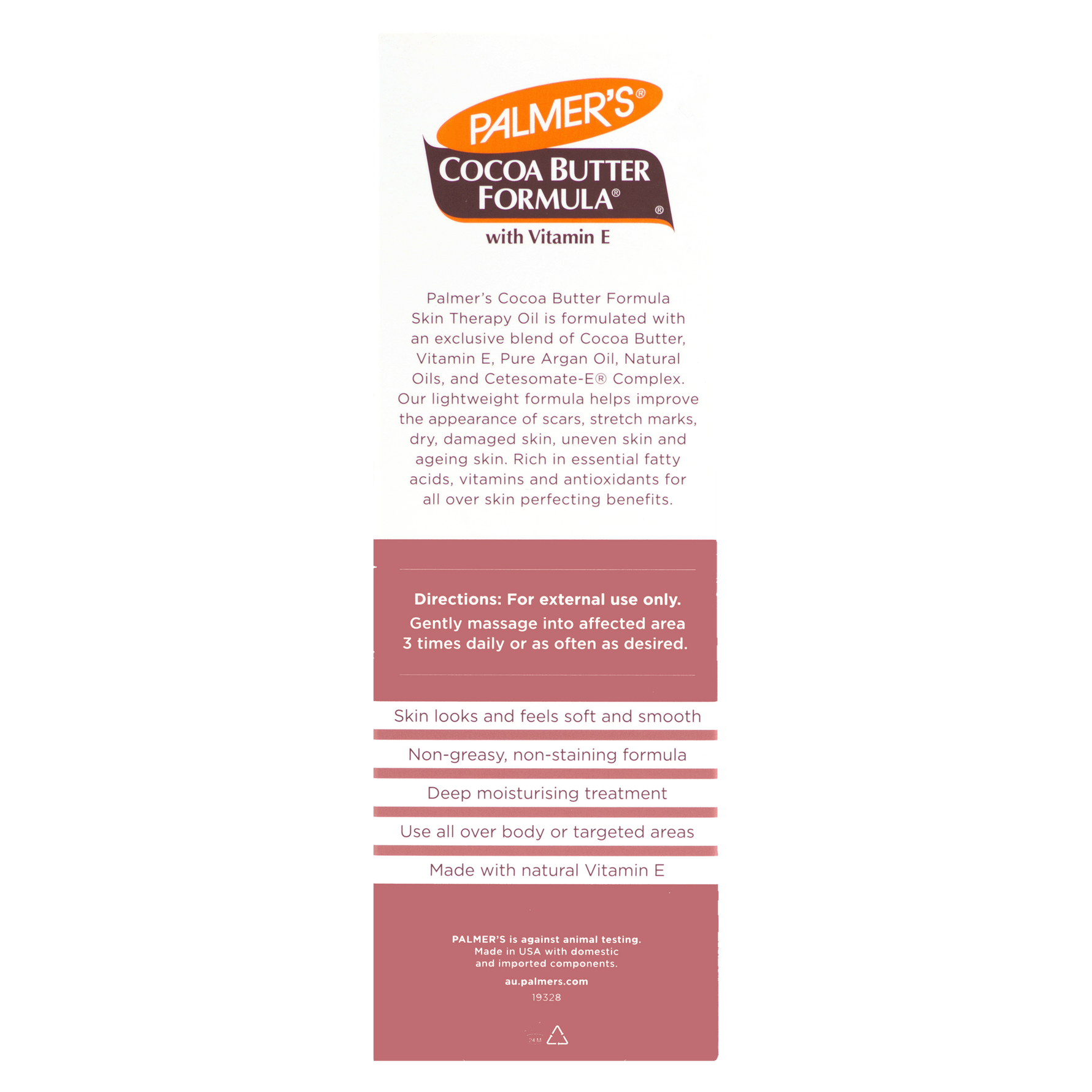 Unit price / perPalmer's® Cocoa Butter Formula Skin Therapy Oil with Rosehip Scent, is a lightweight formula, which helps to improve the appearance of scars, stretch marks, dry, damaged skin, uneven skin and ageing skin. It can be used all over body or for more targeted areas.