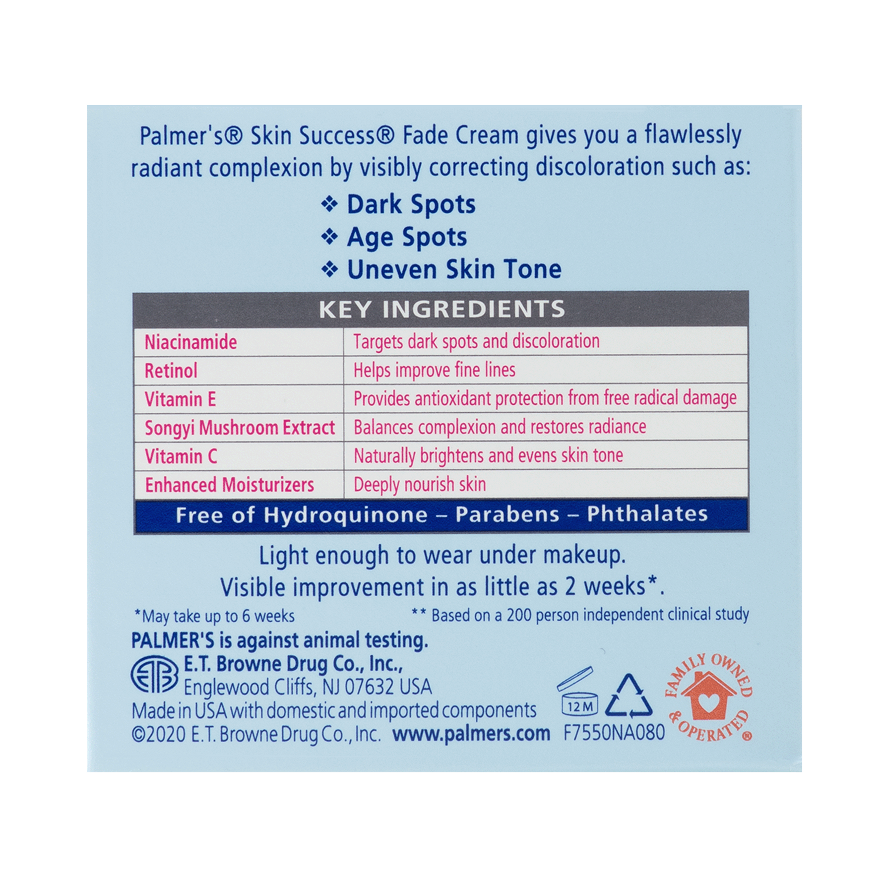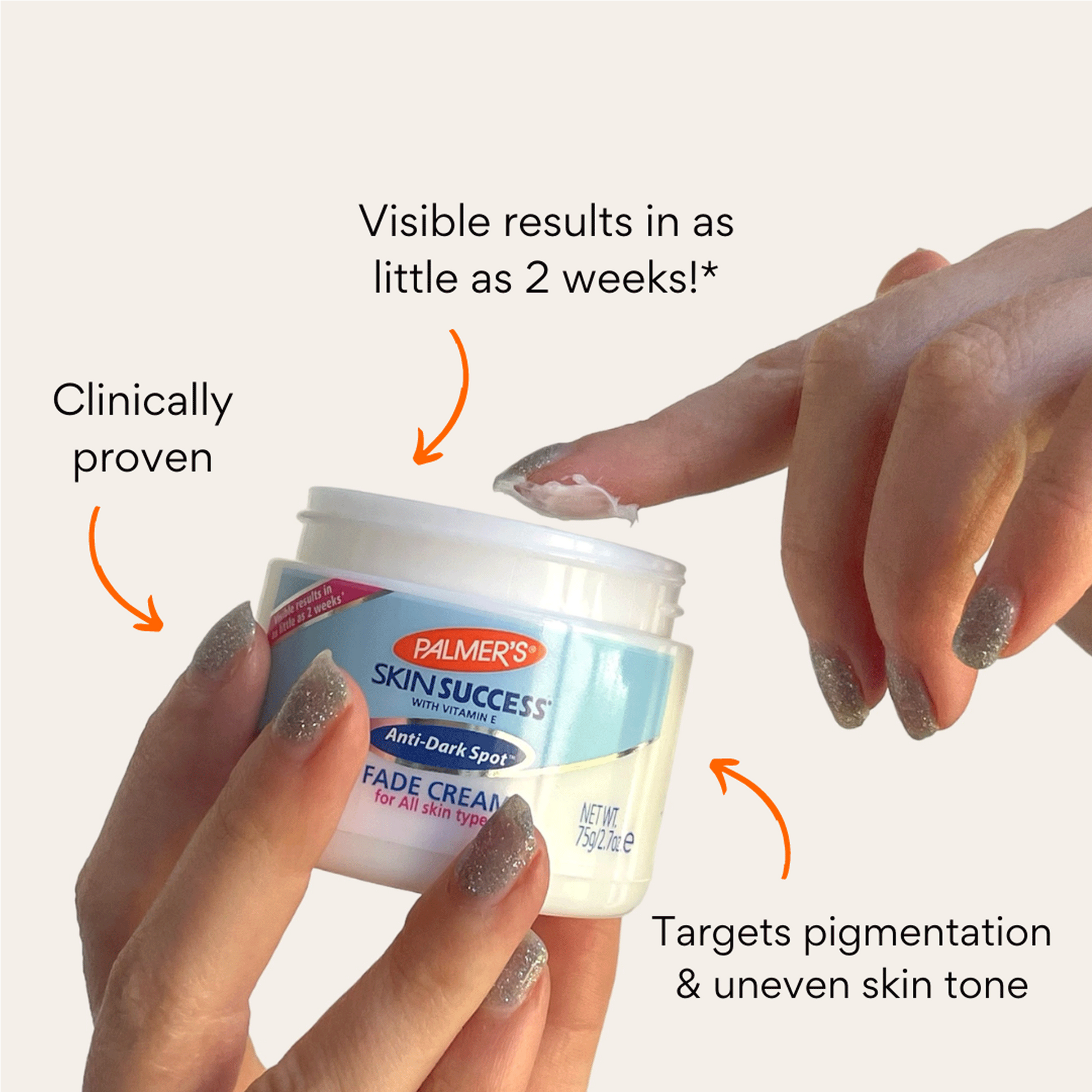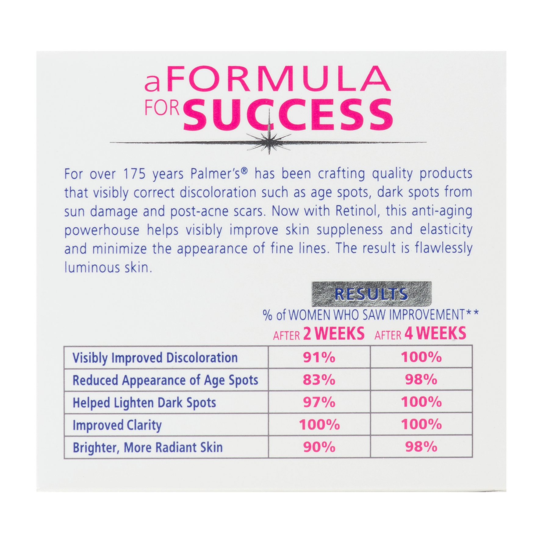 Unit price / perPalmer's® Skin Success Anti-Dark Spot Fade Cream visibly improves dark spots, age spots, post-acne scars and uneven skin tone, and is clinically proven to deliver visible results in as little as 2 weeks!* *May take up to 8 weeks.