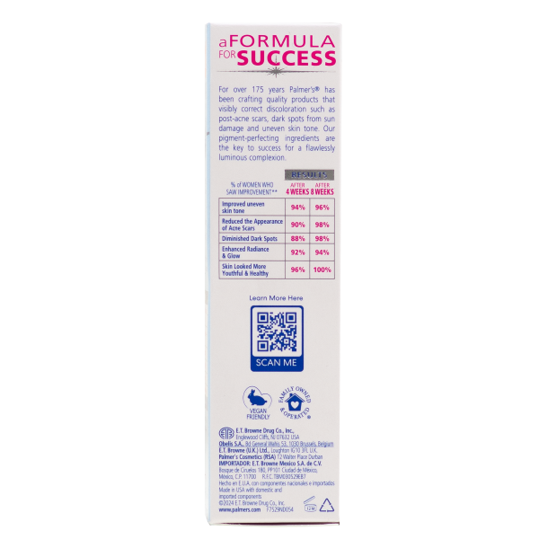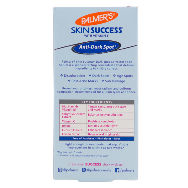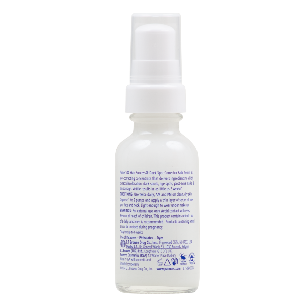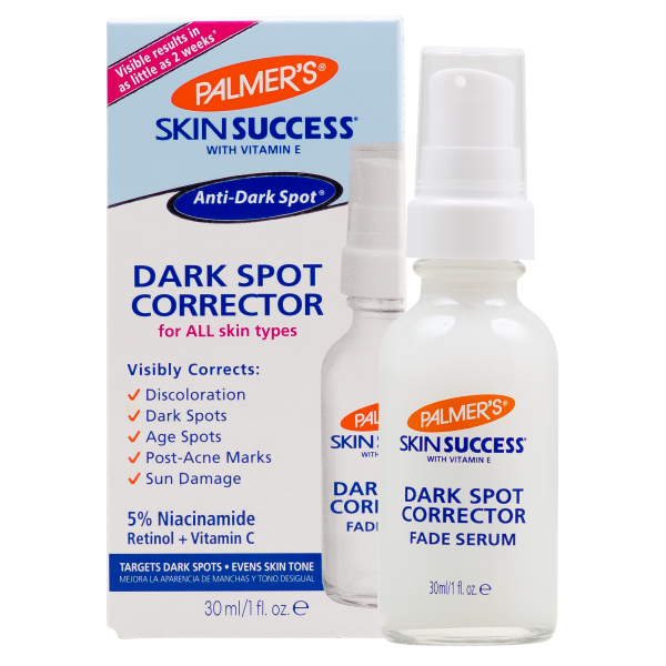 Palmer's® Skin Success Dark Spot Corrector Fade Serum is a lightweight serum made with an effective concentrate of skin-balancing ingredients, which visibly improves dark spots, age spots, post-acne scars and uneven skin tone. Clinically proven to deliver visible results in as little as 2 weeks!*